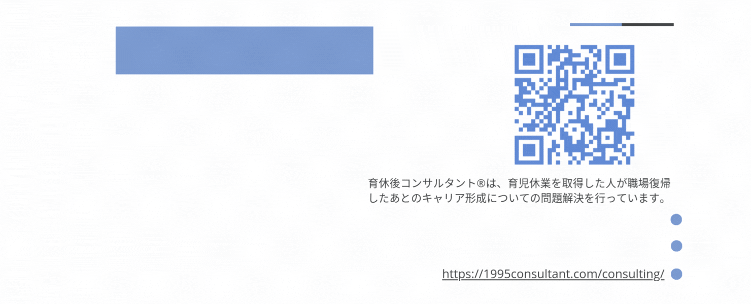 育休後コンサルタントは、子育てしながら企業(組織)で働くことに関して、不安や悩みを抱えているあなたを応援します。