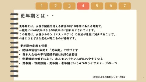 冒頭では、ファシリテーターの方から更年期についての基礎知識をわかりやすく説明していただき、自分の知識が意外にあいまいだったことに気づかされました。